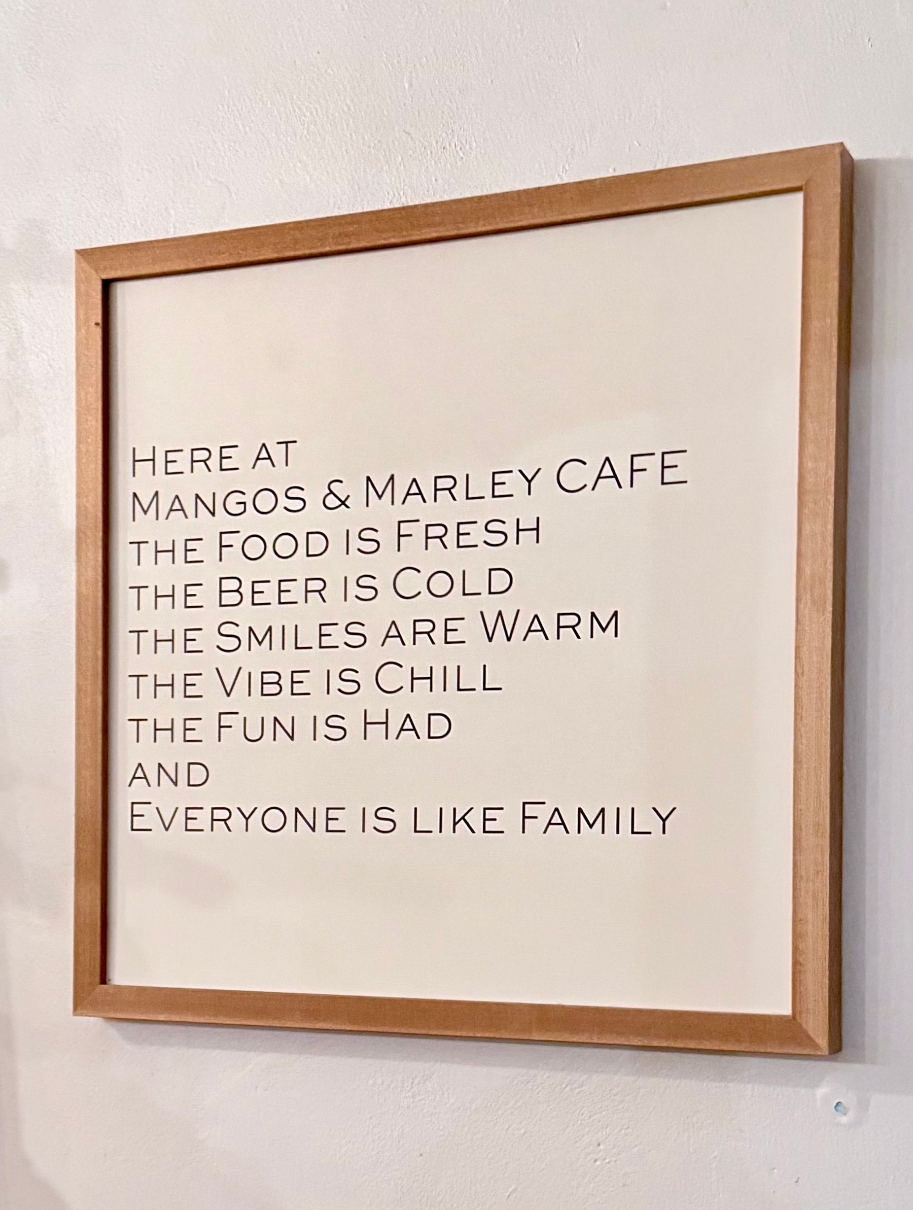 "Here at Mangos & Marley Cafe, the Food is Fresh, the Beer is Cold, the Smiles are Warm, the Vibe is Chill, the Fun is Had, and Everyone is like Family."